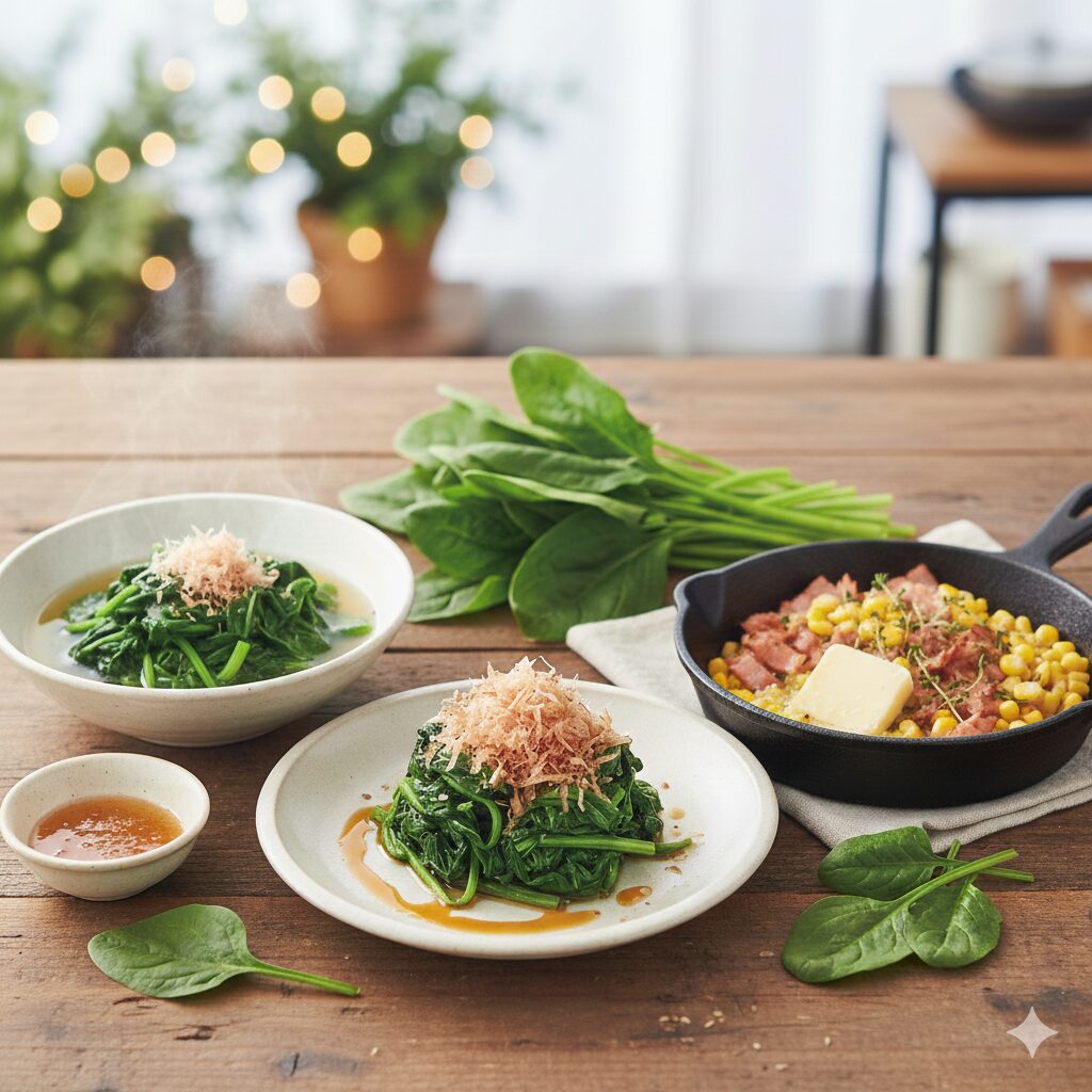 2. 定番の「贅沢おひたし」 茹で時間は短めに(20〜30秒)。冷水に取ってギュッと絞り、だし醤油とかつお節をかけるだけ。 軸のシャキシャキ感と葉のとろける食感のコントラストがたまりません。